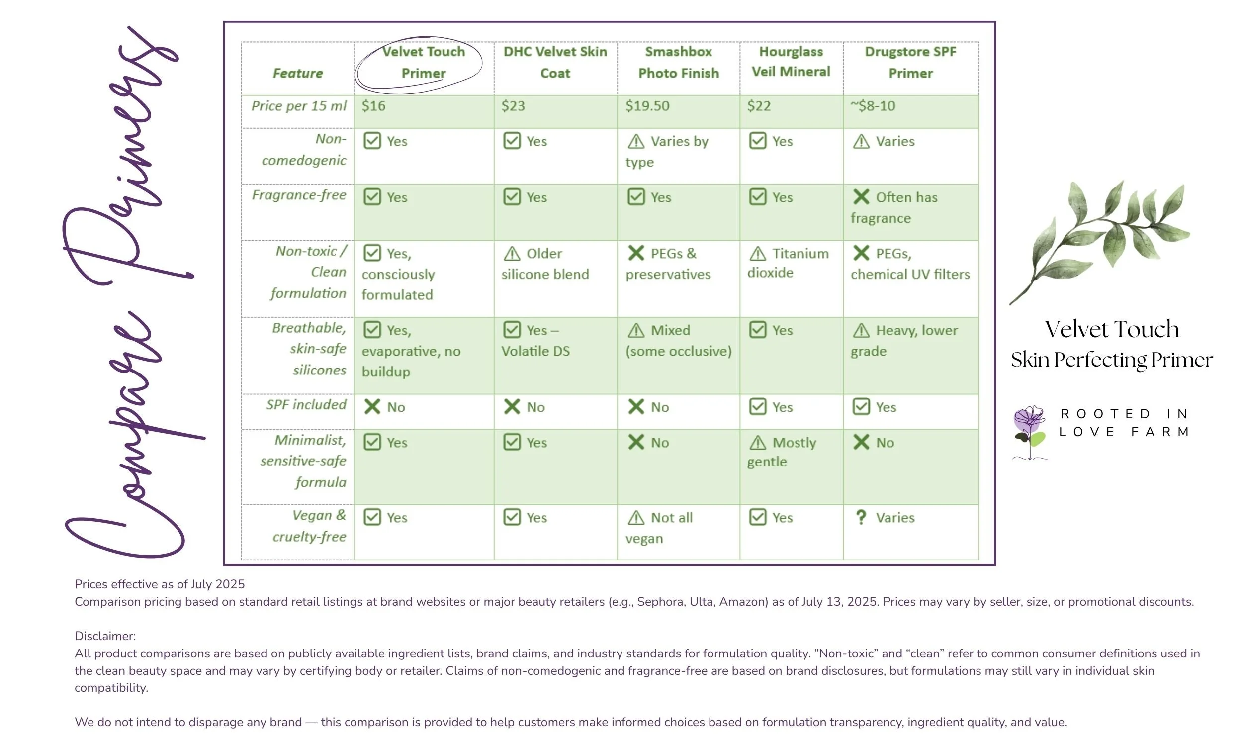 Velvet Touch Primer is consciously formulated using a minimalist INCI list designed to support skin integrity, not overwhelm it.